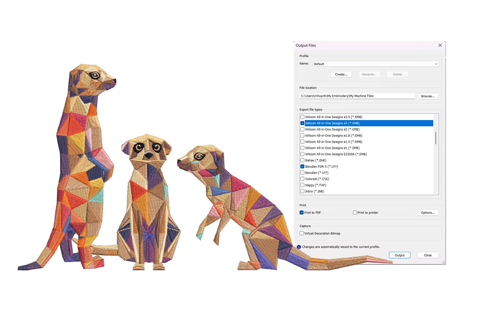Export embroidery designs, machine files, and detailed production worksheets in a single step using customizable export settings.